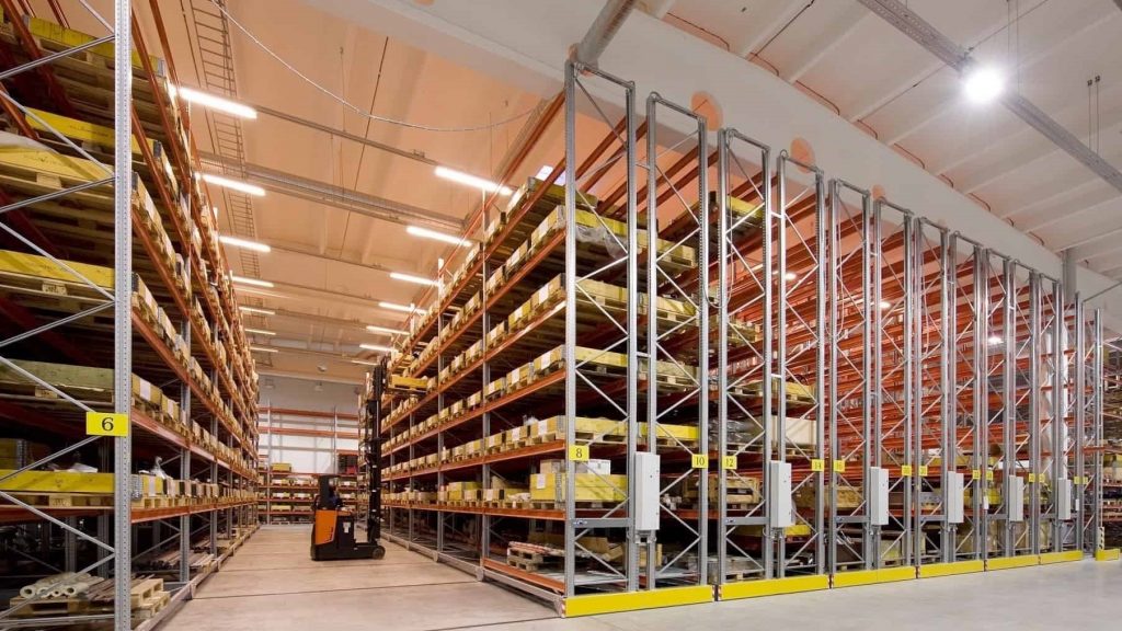 A space-saving system where racks are mounted on mobile bases that move along floor tracks. It offers high storage density and full pallet accessibility, making it perfect for cold storage and compact warehouses.